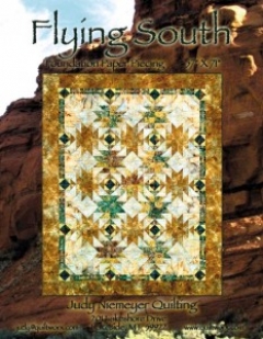 Flying South is the second layout created using a Flying Goose block designed for foundation paper piecing by Judy and Bradley Niemeyer. Sheryl Mycroft designed the setting and color layout for this quilt by placing the lightest background fabric in the Flying Geese triangles, creating a South Western motif using Hoffman Batiks.