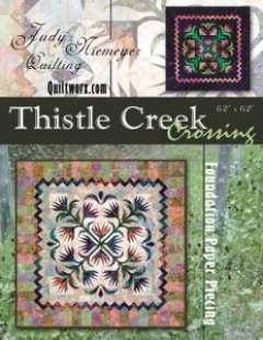 Fabrics for the quilt shown on the cover were designed and donated by Hoffman Fabrics. Sheryl Mycroft and I designed the layout and applique for Thistle Creek Crossing using foundation papers from our Stars and Spike series. Sixteen blocks are made using foundation paper to create the spikes for the Thistle Tops. Sheryl designed the setting so the blocks would float in the background fabric allowing room to add applique stems and leaves to finish the thistles. The applique pieces are large and easy to handle making this a great applique quilt for a beginner. This booklet includes all the foundation paper, cutting instructions, yardage, applique instructions, and templates needed to complete either quilt shown on the cover.