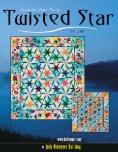 The Twisted Star was designed by my son, Bradley Niemeyer, to meet the requirements for his final project in a college engineering economics course. The project instructions were to develop a product using an engineering tool that could be the basis for a small business. With a little (okay, maybe a lot) of coaxing from his mother, Brad decided to draft and design another quilt pattern for my business. Bradley started with a simple idea of setting a star into a triangle. The stars, although dazzling by themselves, didn’t create a quilt with much energy. He started toying with ways to tie the stars together. A surprisingly simple, yet attractive, interlocking border was created by placing a half melon sliced in six pieces into each side of the triangle. This made the star quite distinctive from others due to the mismatched points that it created, three being long and three being short. This mismatched quality was very appealing as it gave the appearance of a star that had been twisted upon itself, giving rise to the name, “Twisted Star.” The foundation piecing units are very simple to make. The ribbons are made using a method of strip piecing with foundation paper. The curved piecing level of this quilt is defiantly at a beginner lever. The background for this quilt was created by blending the value, texture, and color of several fabrics.