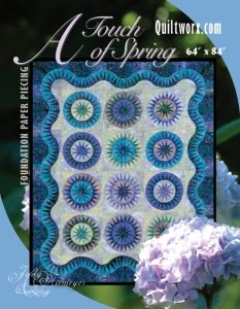 A Touch of Spring was designed by Judy and Bradley Niemeyer. We wanted to add a quilt to our collection with a simple design, a traditional look, and a touch of elegance. A collection of fabrics designed by Hoffman Fabrics of California were used to make the quilt on the cover page. A sewing technique called foundation paper piecing is used when sewing the pieces onto the foundation units. Floating Spikes and Template Layout Sheets were designed to help speed up the cutting and sewing process. Curved piecing, and traditional piecing skills are required to join the units after the foundation piecing is completed.