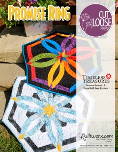 The Promise Ring pattern is a Cut Loose Press pattern, which is different than a traditional Quiltworx pattern in that it utilizes various tools and Charm Elements (for more information on Charm Elements, click HERE) to create fast, fun, projects and layouts aimed at the beginner or a customer that simply wants to try out a fast project to learn a new technique or how to use a new tool.