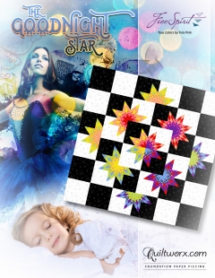 The Goodnight Star layout includes foundation papers to make (24) 16″ quarter lone star blocks. The pattern was designed by Judy and Bradley Niemeyer and creates an introductory pattern that can be used to learn basic paper piecing techniques required for many of our lone star projects.