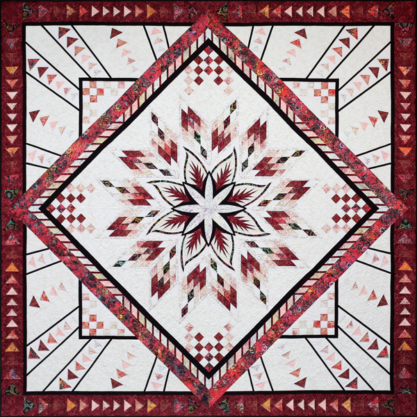 The cover quilts feature the warm, spicy palette of the Timeless Treasures Apple Basket Collection, designed by Judy and Judel Niemeyer. The stunning 118″ sample — expertly pieced by Certified Instructor Tracy Thompson of Lotus Owl Fiber Arts, LLC –shows off the pattern’s tropical elegance, and the quilting is nothing short of gorgeous.