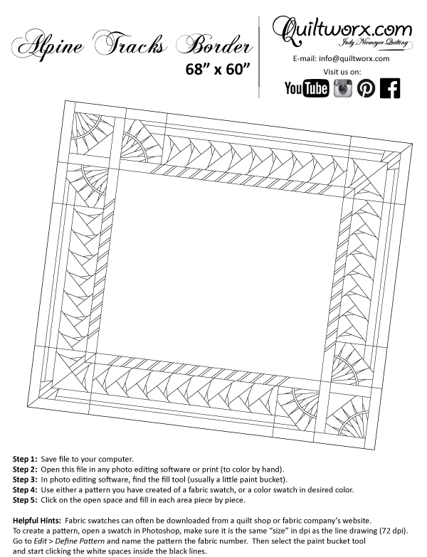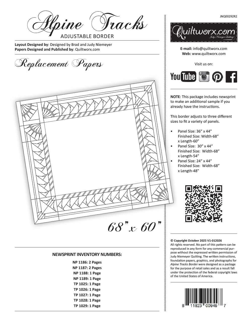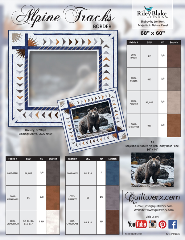Where the wild calls and the river runs cold, Alpine Tracks Border brings the majesty of the great outdoors straight into your home. Designed by the talented duo Judy and Brad Niemeyer, this stunning foundation paper pieced border frames your favorite panel with bold flying geese, classic bear paw blocks, and elegant decorative line borders — every element a nod to the untamed beauty of the wilderness.