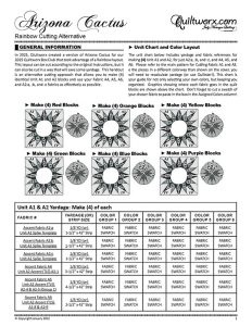 Arizona Cactus was designed by Quiltworx.com in 2012 as a beginner project to teach the basics of paper piecing. The pattern has gone through an update in 2018. The cactus block used in this pattern has been used in several Quiltworx patterns in a variety of different layouts. A layout for this quilt is available in Quiltster. Quiltster is an online app that not only allows you to audition fabrics in your quilts before you buy, but also shares blocks across several layouts. It also allows you to switch out blocks that are identically sized for others, creating a wide range of finished quilt options. To learn more about Quiltster, visit http://www.quiltster.com. Foundation paper piecing, Template Layout Sheets, floating points, and Smart Corners are featured in these instructions, as they have become design standards that our customers have come to expect when they work with one of our patterns.