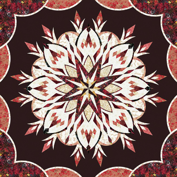 Cabaret is a foundation paper pieced design by Judy and Bradley Niemeyer. The Hoffman Batiks in Garnet Glow and Driftwood, inspired this dark, vintage brooch or Flapper-style hair piece reminiscent of a Speakeasy or Cabaret style performer. The layers of curves and spikes in the foundation paper piecing and Broadway curtain themed border make this design one that is sure to be a conversation piece.