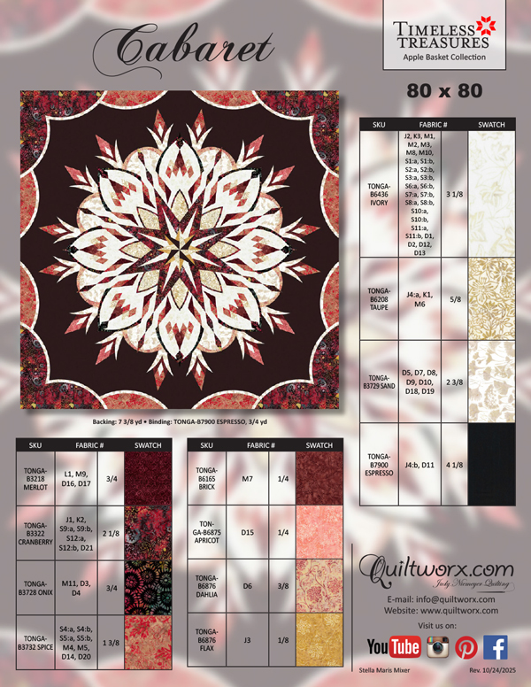 Cabaret is a foundation paper pieced design by Judy and Bradley Niemeyer. The Hoffman Batiks in Garnet Glow and Driftwood, inspired this dark, vintage brooch or Flapper-style hair piece reminiscent of a Speakeasy or Cabaret style performer. The layers of curves and spikes in the foundation paper piecing and Broadway curtain themed border make this design one that is sure to be a conversation piece.