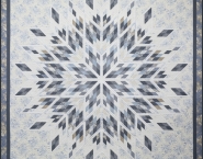 The cover quilt showcases Marcus Fabrics’ Franklin House Collection designed by Delores Smith. Soft cream and blue tones in the background fabric beautifully offset by deeper greys and beiges create a delicate lace-like illusion. The result is a quilt as refined as it is cozy—perfect as a bedroom centerpiece, wall hanging, or cuddle quilt.
