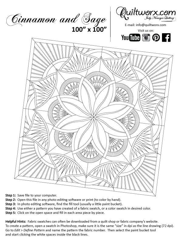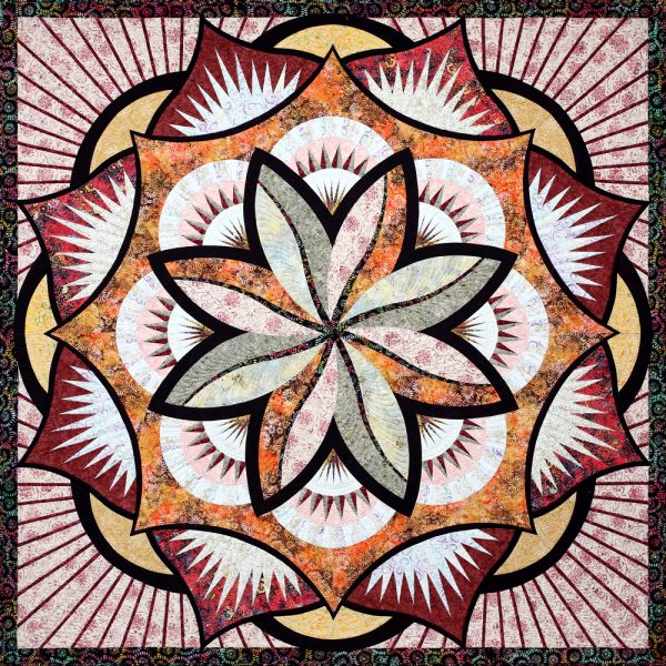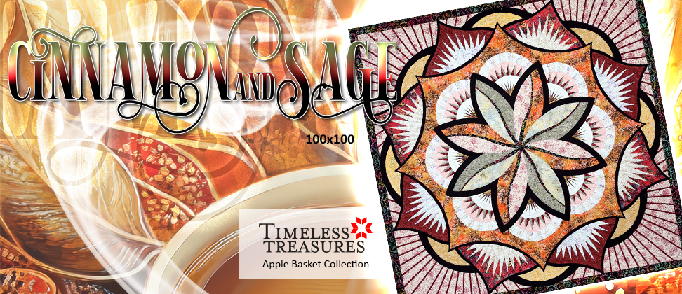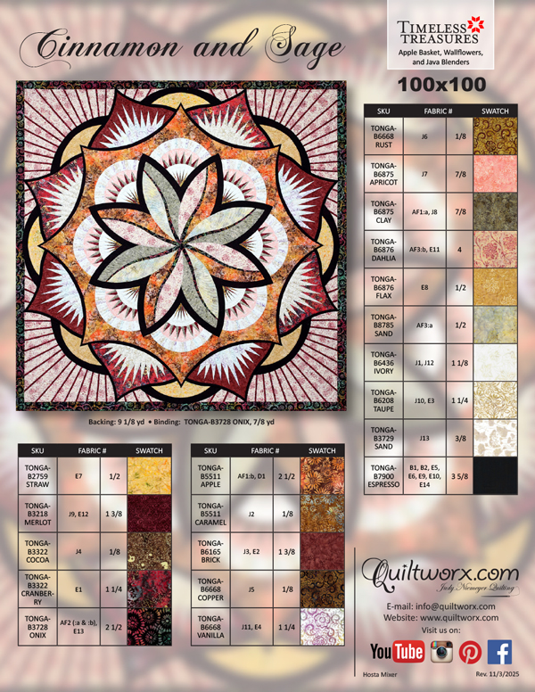Wrap yourself in the warmth of fall with Cinnamon and Sage, a stunning quilt pattern from Judy and Bradley Niemeyer, part of the beloved Hosta Medallion Mixer series. This 100″ x 100″ quilt radiates the rich, spicy hues of the season—think cinnamon sticks, steeping teas, and crisp leaves underfoot. Designed with a colorway by Judel Niemeyer using Quiltster, it features fabrics from our latest Apple Basket collection by Timeless Treasures: deep burgundies, glowing oranges, earthy sage greens, and dramatic contrasts of black and light fabrics.