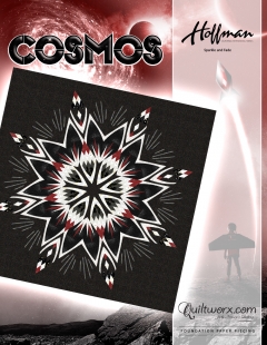 Cosmos: The Cosmos foundation papers, strip piecing processes and color concept were designed by Quiltworx. The blocks in this quilt require a combination of paper piecing skills, strip piecing skills, and traditional piecing skills. The block is used in a 91” x 91” layout that includes (48) diamonds. The diamonds used in this quilt are called the Ribbon Star, Basket Star, and the Shimmering Star. The diamonds are surrounded by a Blank Background and the fabrics are the perfect colorway to remind you of exploring the stars in your own rocket ship at warp speed.