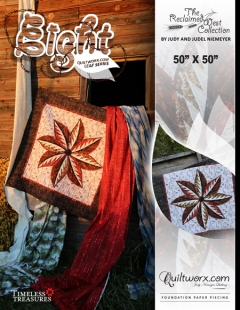 Judy, Judel and Brad Niemeyer designed the layout, instructions, and foundation papers for Eight, which is a pattern in the Quiltworx.com Leaf Series.The Leaf Series is a collection of patterns designed to teach quilters some of Judy’s latest techniques, including curved paper piecing and applique of paper pieced units. This is our first pattern to use the collection of fabrics designed by Judy and Judel Niemeyer called Reclaimed West, by Timeless Treasures! Fabrics from this collection were selected to make the sample shown on the cover. A sewing technique called foundation paper piecing is used to assemble the units required to make this quilt. Curved piecing, traditional piecing, and applique are are used to assemble the wall hanging after the foundation piecing is completed.