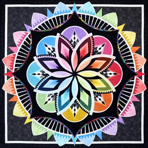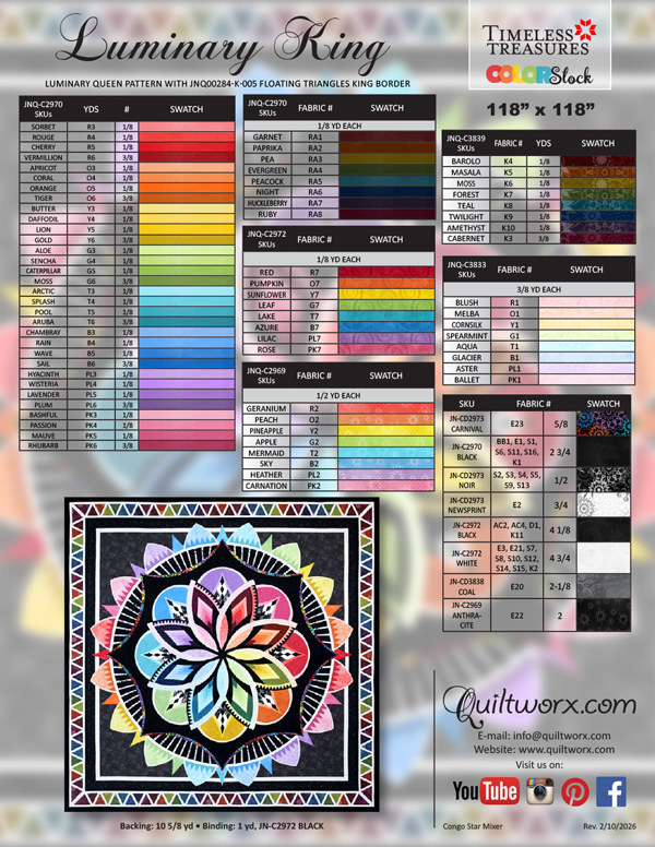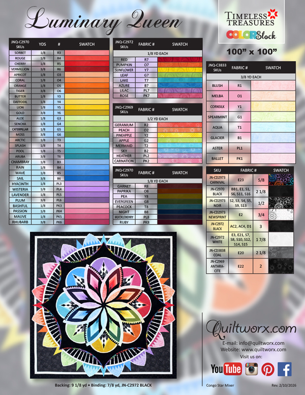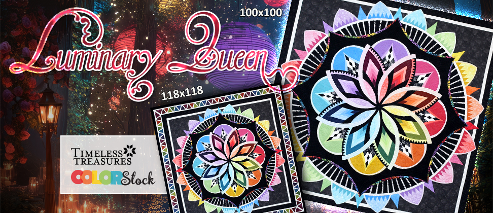 The cover sample, beautifully quilted by Louise Klare of K7 Quilting, showcases our newest 2025 ColorStock fabrics from Timeless Treasures, designed by Judy and Judel Niemeyer. The interplay of light, medium, and dark rainbow tones creates a luminous sense of depth and movement, giving the quilt a glowing, dimensional quality that feels almost illuminated from within. Whether displayed on a bed or hung as a dramatic wall medallion, Luminary Queen instantly becomes the focal point—the piece that anchors the room and draws every eye.