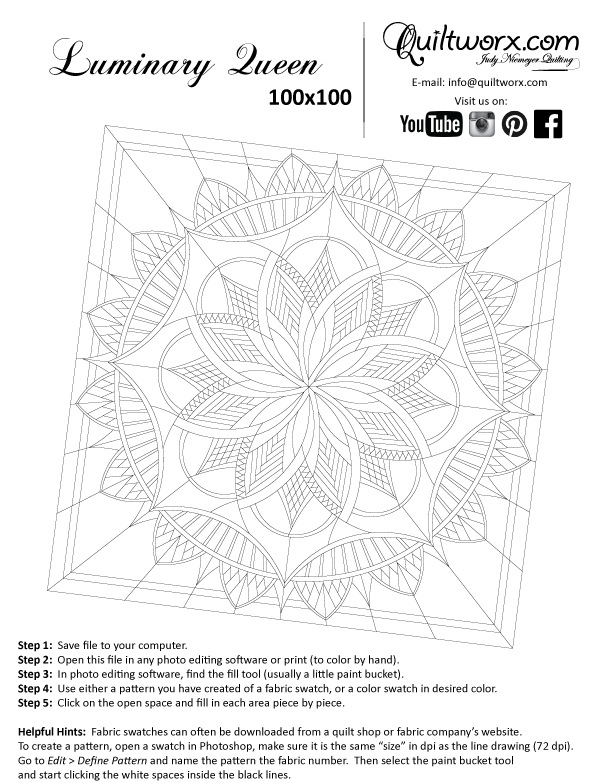 Click on the Project button to access the pattern templates and begin coloring with fabrics uploaded from your stash and/or fabric collections from across the industry! A Quiltster account is required to use the coloring tool.  If you do not have a Quiltster account already, you will need to subscribe and log in before these links will work. Subscriptions can be obtained by going to http://www.quiltster.com, click on Subscribe!