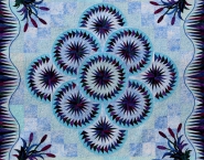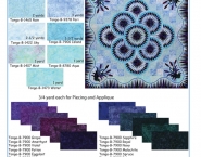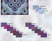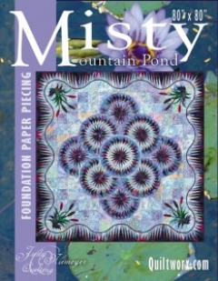 Bradley and Judy Niemeyer designed the foundation pieces and layout for the Misty Mountain Pond. A collection of blues, purples, and teals designed by Hoffman fabrics were used to make this quilt. A sewing technique called foundation paper piecing is used when sewing the pieces onto the foundation units. Curved piecing, traditional piecing, and applique skills are required to join the units after the foundation piecing is completed.
