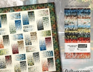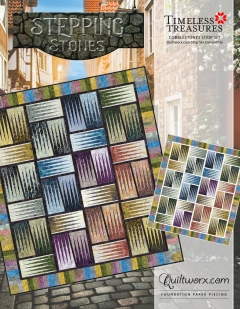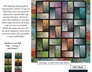 The Stepping Stones shown on the cover is our latest update to a very popular pattern designed by Judy and Brad Niemeyer several years ago. Paper piecing and traditional piecing techniques are required to assemble this quilt. The pattern teaches a simple concept using two strips of fabric to create one appealing block design. This quilt was designed as a fun and fast quilt for all skill levels of quilters and is very fast to complete.