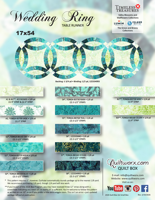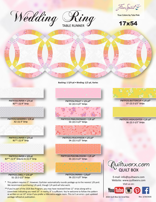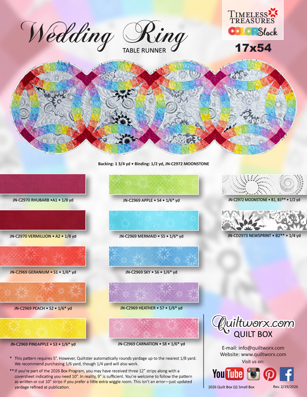 The beloved Wedding Ring aesthetic gets a fresh, approachable twist in the Wedding Ring Table Runner, first introduced as the 2026 Q1 project in the Quiltworx Box Program Small Box—and now available as a stand‑alone pattern for everyone to enjoy.