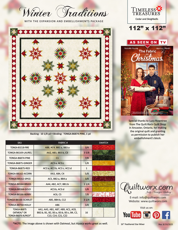 Inspired by the quilt featured in the holiday film The Fabric of Christmas, this optional package expands Winter Traditions to a stunning 112″ x 112″ masterpiece. The border and embellishments replicate the cinematic version of the quilt, adding drama, elegance, and heirloom-worthy detail.
