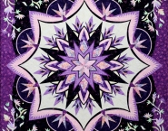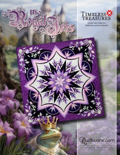 The Royal Iris is constructed using five distinct sections: Group J is comprised of (8) center diamonds; Groups K and L radiate out from the center star in two additional rounds of (8) star points each; Group N is a pieced medallion-style border that prepares the center star for the outer border; and Group D is a pieced and appliquéd medallion border added to the rounds to result in a 99″-square quilt. The quilt blocks were designed by Judy and Bradley Niemeyer. The layout and colorway was created by Judel Niemeyer using Quiltster.
